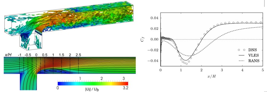 Special attention was devoted to derivation of a seamless formulation of an eddy-resolving hybrid RANS/LES modelling strategy. The subscale model functioning as such in the entire flow domain in this so-called VLES (Very LES) modelling concept is represented by a specifically sensitized RANS-based model; the near-wall eddy-viscosity model proposed by Hanjalic et al. (2004, Int. J. Heat and Fluid Flow 25(6):1047-1051) is adopted and further developed for this purpose, Chang et al. (2015), Krumbein et al. (2017a, 2018a). Key issue is the formulation of the so-called “resolution function” describing the ratio of the corresponding turbulent length scale and the one extracted from the underlying grid (the grid-spacing is, generally speaking, proportional to the largest unresolved scale). Herewith, a seamless transition is enabled from a RANS-model (related to fully-modelled turbulence) to a VLES-related sub-scale model (describes unresolved turbulence scales). In addition, a grid-spacing free eddy-resolving model formulation has been developed (Krumbein et al, 2019b). This model represents a first step towards the modelling activities planned for the second project period (see section “Current work”). Effects of the wall roughness onto the flow structure were modelled by the so-called “discrete element method”, relying on introducing a drag-like term into the equation of motion – denoted as “distributed drag force” (DDF); the relevant “form function” representing the part of the corresponding “drag coefficient” has been obtained by applying a data-driven procedure using the complementary DNS database (subproject B02 supervised by Frohnapfel and Magagnato; see e.g. Krumbein et al., 2017b). In addition, the so-called equivalent porosity method (EPM) for handling the flows over rough walls has also been proposed (Krumbein et al, 2019a). The relevant flow solver based on the Volume-Averaged Navier-Stokes (VANS) equation has been previously validated by computing the flow over a porous wall (the DNS reference database by Breugem et al. 2006, J. Fluid Mech. 562:35-72 has been utilized).